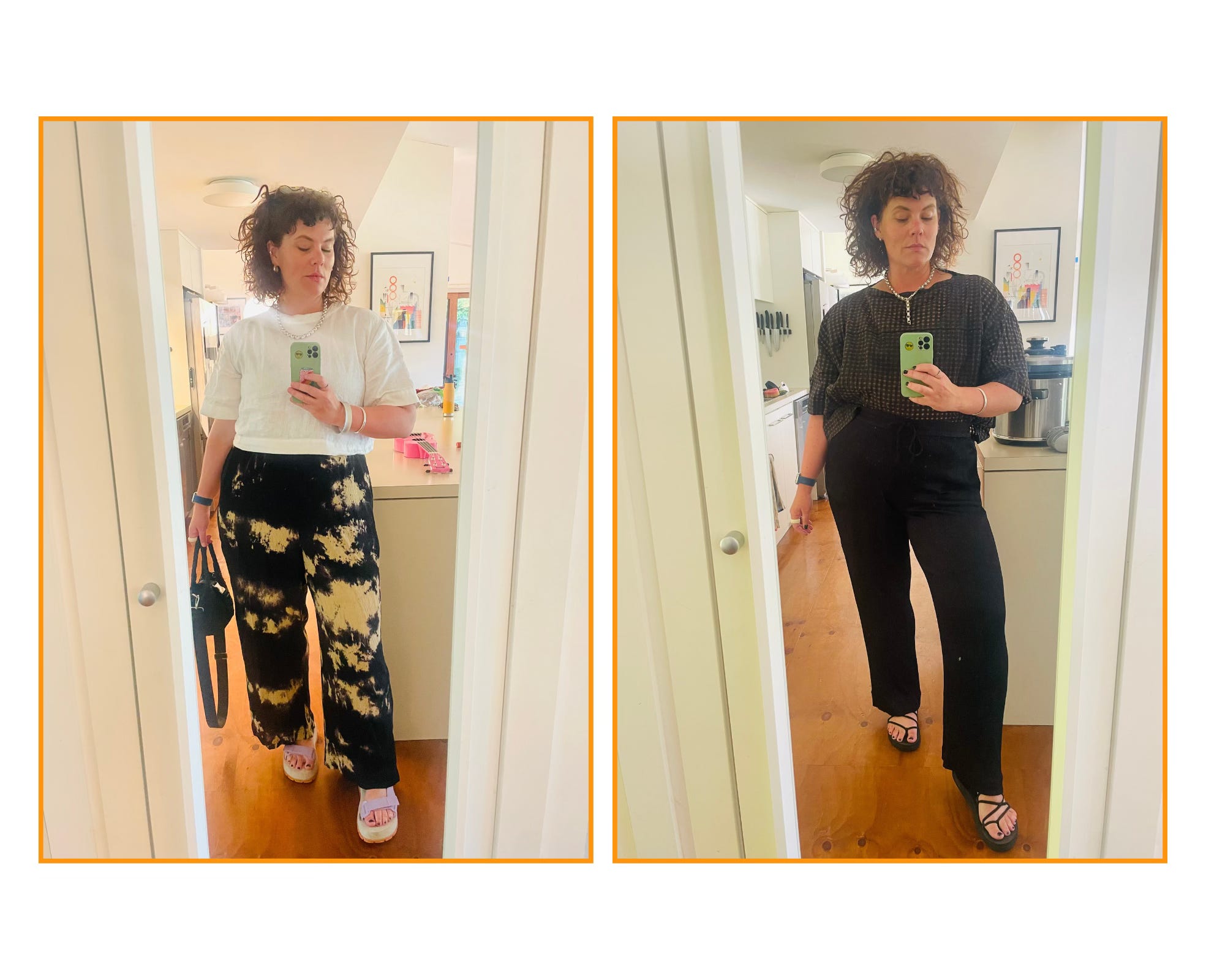 We had 7 days of high 30s temps last week so I haven’t worn anything very exciting but here’s 2 outfits I snapped. One was worn for donating plasma, but I didn’t end up donating. I got right to the chair and their head office called and said it had become too hot for anyone to donate so I had to leave. Bummer. The other outfit was for pootling around with the kids after school, library, ice cream. The usual.